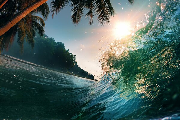sea ​​wave beautiful sunset scene water splash tropical paradise ocean sea waves sunlight nature landscape palm trees sea wave beautiful sunset scenes palm