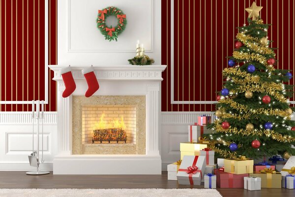 New Year's image of a blazing fireplace with red socks for gifts2133 x 1200, 738 kB