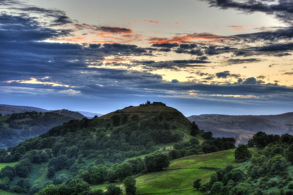 misty castle fantasy sunset hill creepy trees sky foggy tree