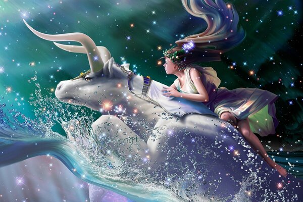 cg wallpapers yutaka kagaya zodiac taurus starry tales stars flight dreams fantasy yutaka kagayya constellation girl europe zeus bull wreath tiara galaxy waves spray