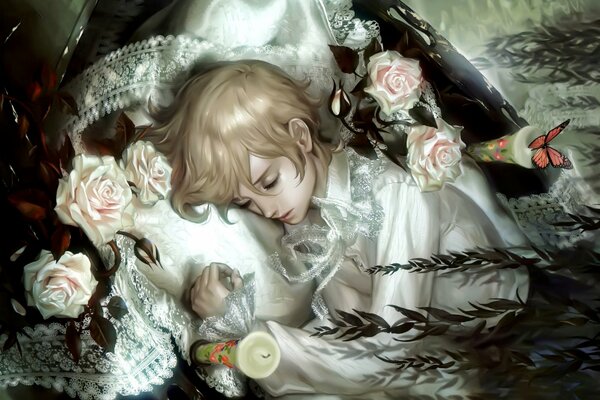 midori foo art fantasy sleeping boy fairytale candles butterfly flowers pink roses flower roses tale