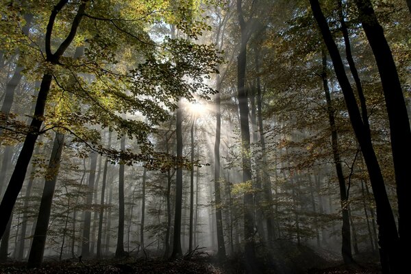 forest fog rays autumn tree