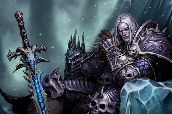 arthas the lich king arthas menethil sword frostmourne sitting on a the frozen throne crown prince of lordaeron knight of the silver hand son of king terenas menethil ii became a death knight powerful