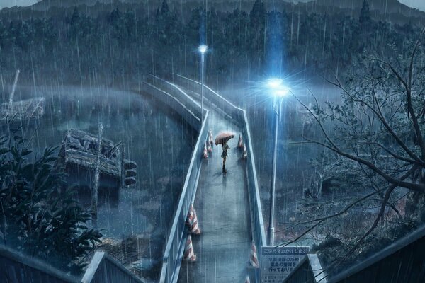 A girl with an umbrella standing alone in the rain on a bridge1920 x 1428, 529 kB