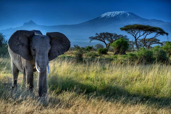 An elephant with large tusks on the background of a yellow clearing in the fog1920 x 1200, 512 kB