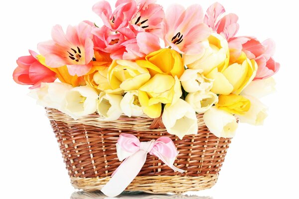 tulips flower bouquet shopping basket bow belt tulip spring nature1920 x 1441, 301 kB