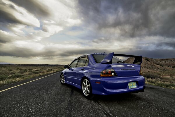 mitsubishi lancer evolution viii blue view road clouds2041 x 1200, 353 kB