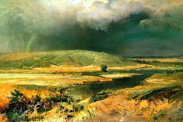 painting vasiliev fedor volga lagoon pattern landscape river water creek shore hills sky clouds1920 x 1080, 423 kB