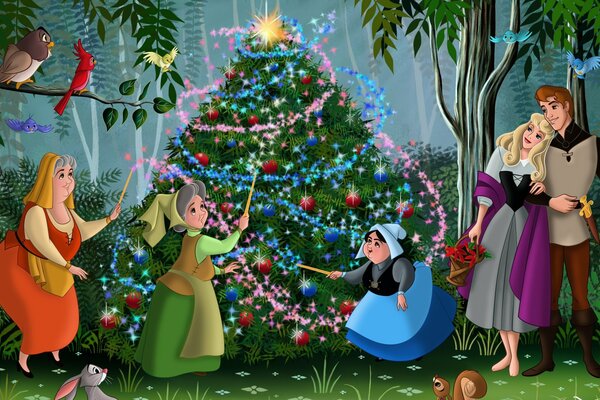 sleeping beauty walt disney christmas christmas tree fanart movie animated film fairytale princess aurora phillip forest flowers fairies friends birds cartoon tale new year rose at1978 x 1200, 512 kB