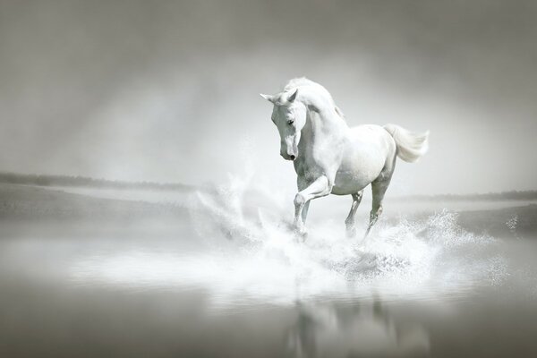 The horse runs in shallow water and raises a lot of spray1920 x 1080, 362 kB