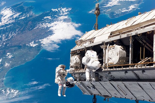 The work of Astronauts in weightlessness against the background of the Earth1920 x 1440, 554 kB