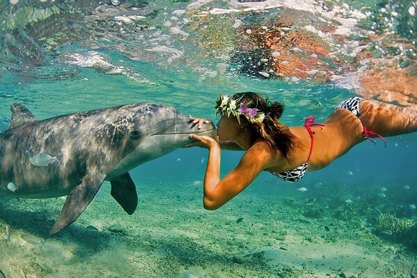 Girl kisses dolphin underwater1680 x 1050, 509 kB