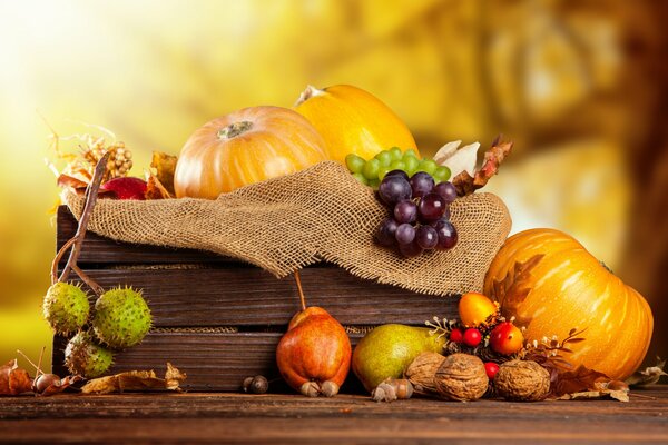 autumn vintage fruits vegetables pumpkin grapes pear nuts chestnut box burlap1920 x 1230, 397 kB