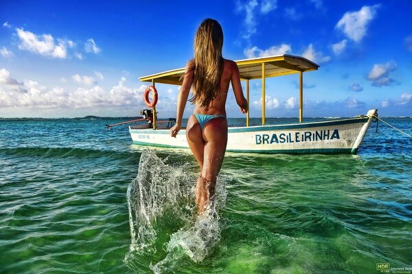 A girl in a bikini walking to the boat1920 x 1200, 542 kB