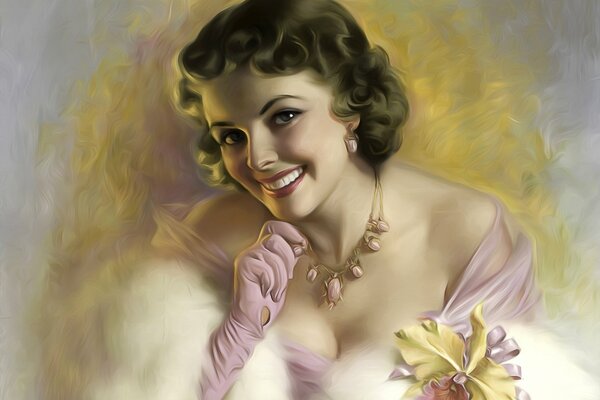 portrait girl hair style retro coquette smile orchid necklace gloves beauty cleavage view1920 x 1373, 223 kB