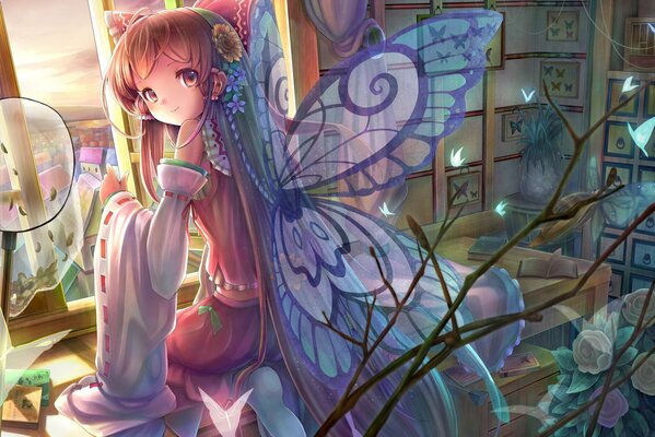 art sanntouhei touhou hakurei reimu girl sitting wings butterfly room window table book flower smile