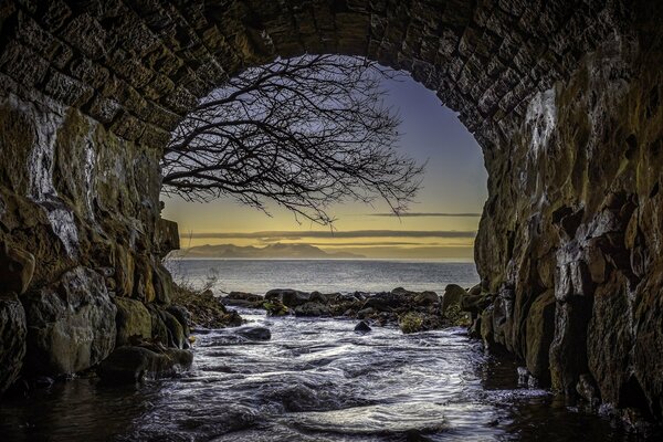 Beautiful view of the water through a tunnel in Scotland