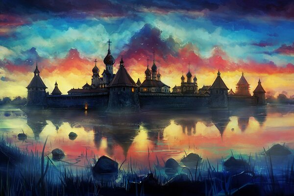art painted landscape monastery lake sunset birds1977 x 1080, 307 kB