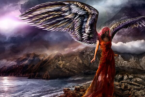 vitaly s. alexius fiction girl angel wings red dress rock mountain water ocean sea sky clouds1920 x 1080, 472 kB