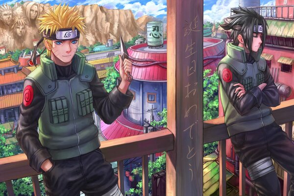 art zhouran naruto shippuden uchiha sasuke uzumaki naruto man town knife balcony rails characters rock face