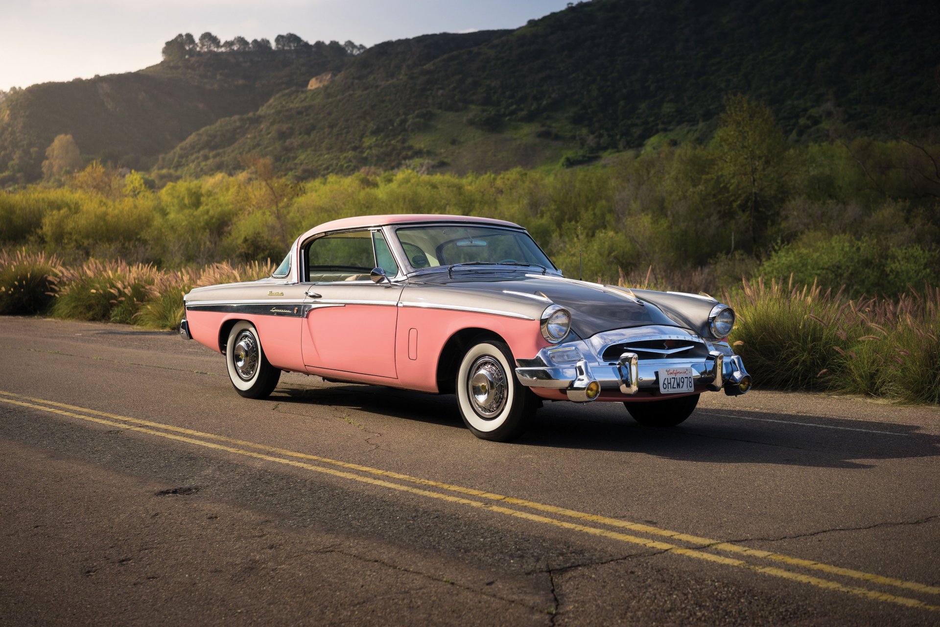Pink retro Studebaker on the background of hills