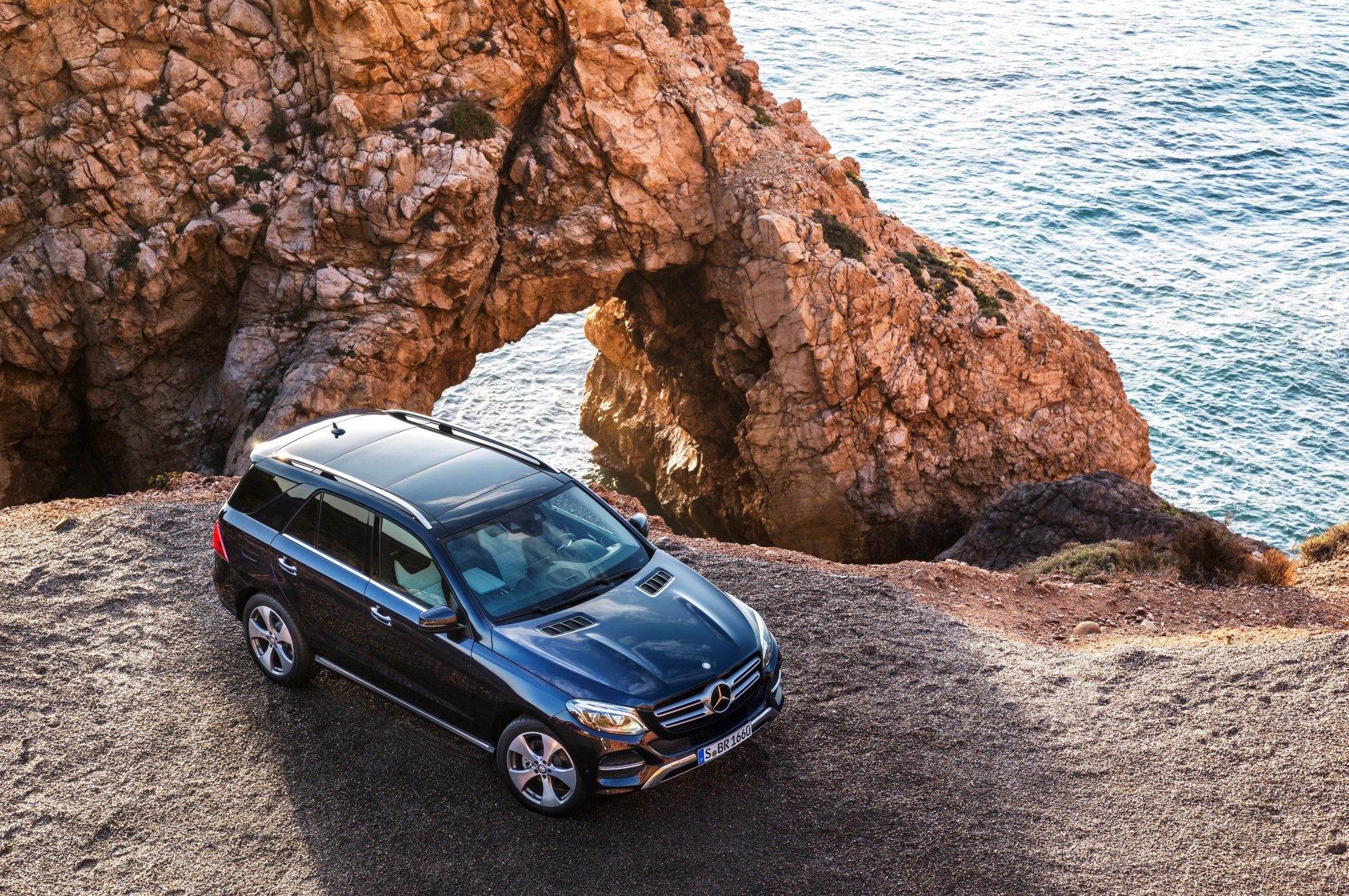 Blue Mercedes amg gle 63s 4matis w166 on the background of rocks and the sea