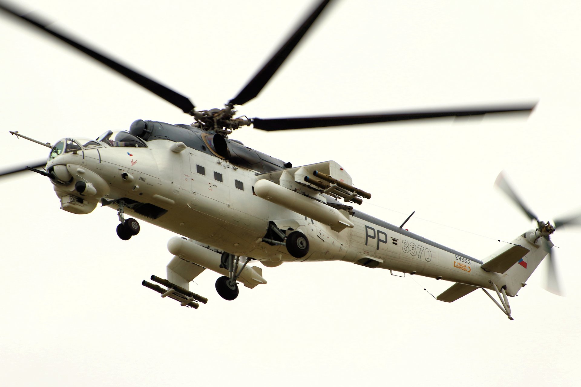 Mi-24 helicopter in flight on a white background