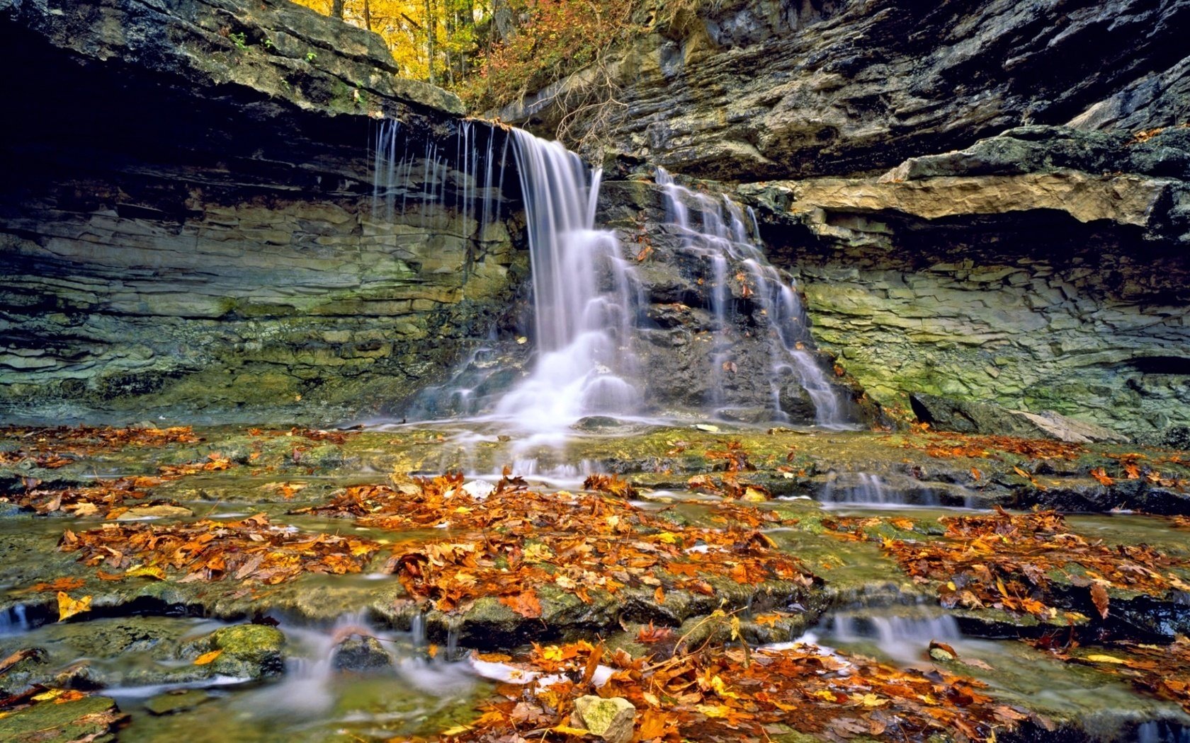 Image tags:autumn foliage, rocks, water, waterfalls, streams, falling leaves, golden time, indian summer, yellow leave