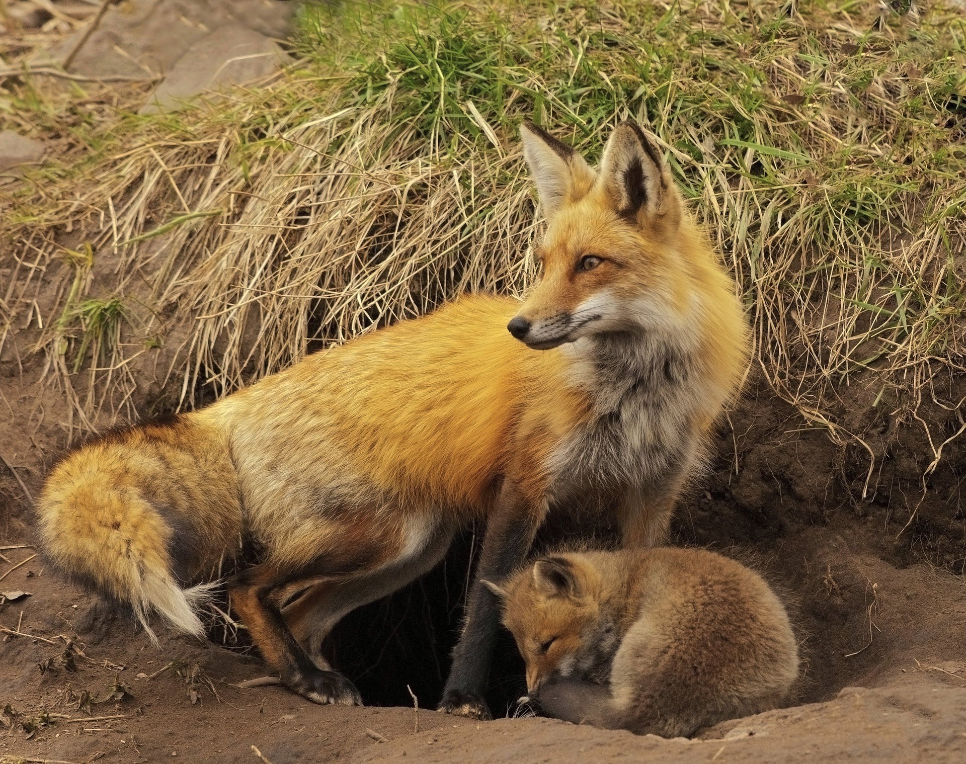 A fox and a fox cub in yellow straw
