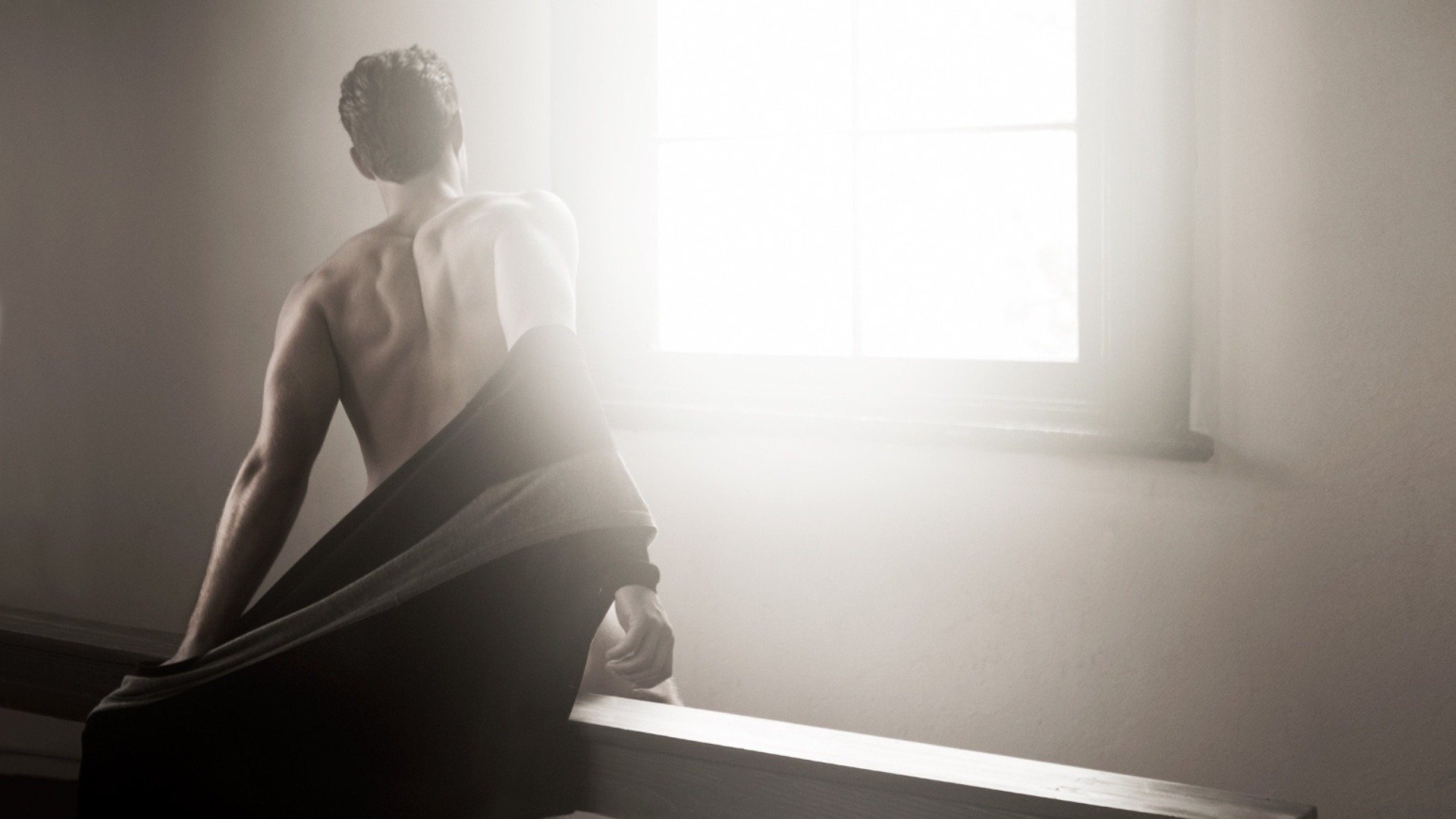 A half-naked man from the back by the window