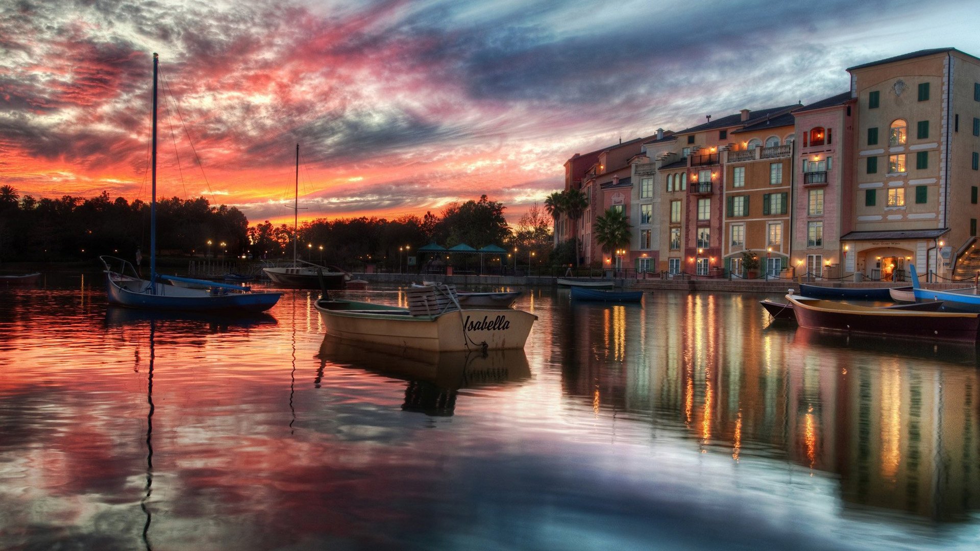 Image tags:town on the water, small boats, sunset, water, river, the sky, building, city, the evening, boats, surface, mirror, reflection