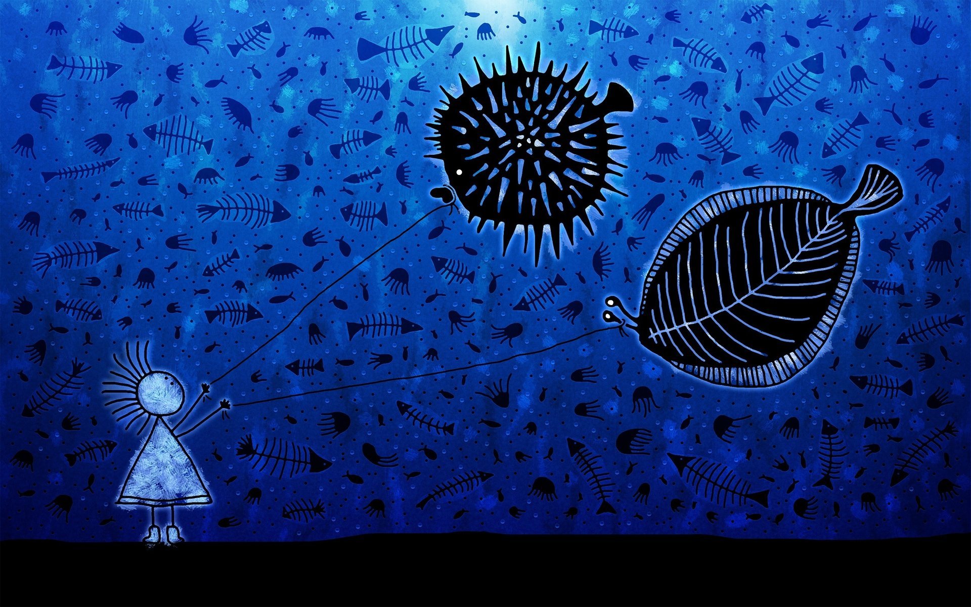 Abstract drawing of a girl with a fish skeleton and a microbe