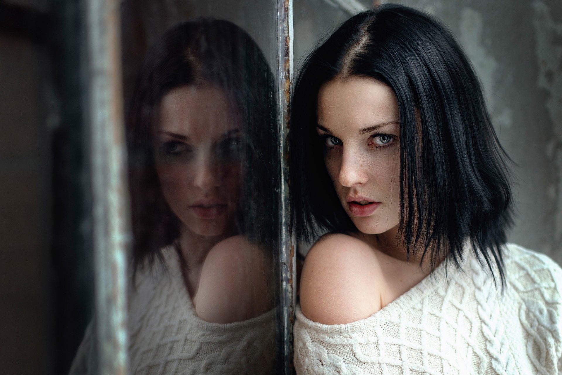 Brunette by the window in a white sweater