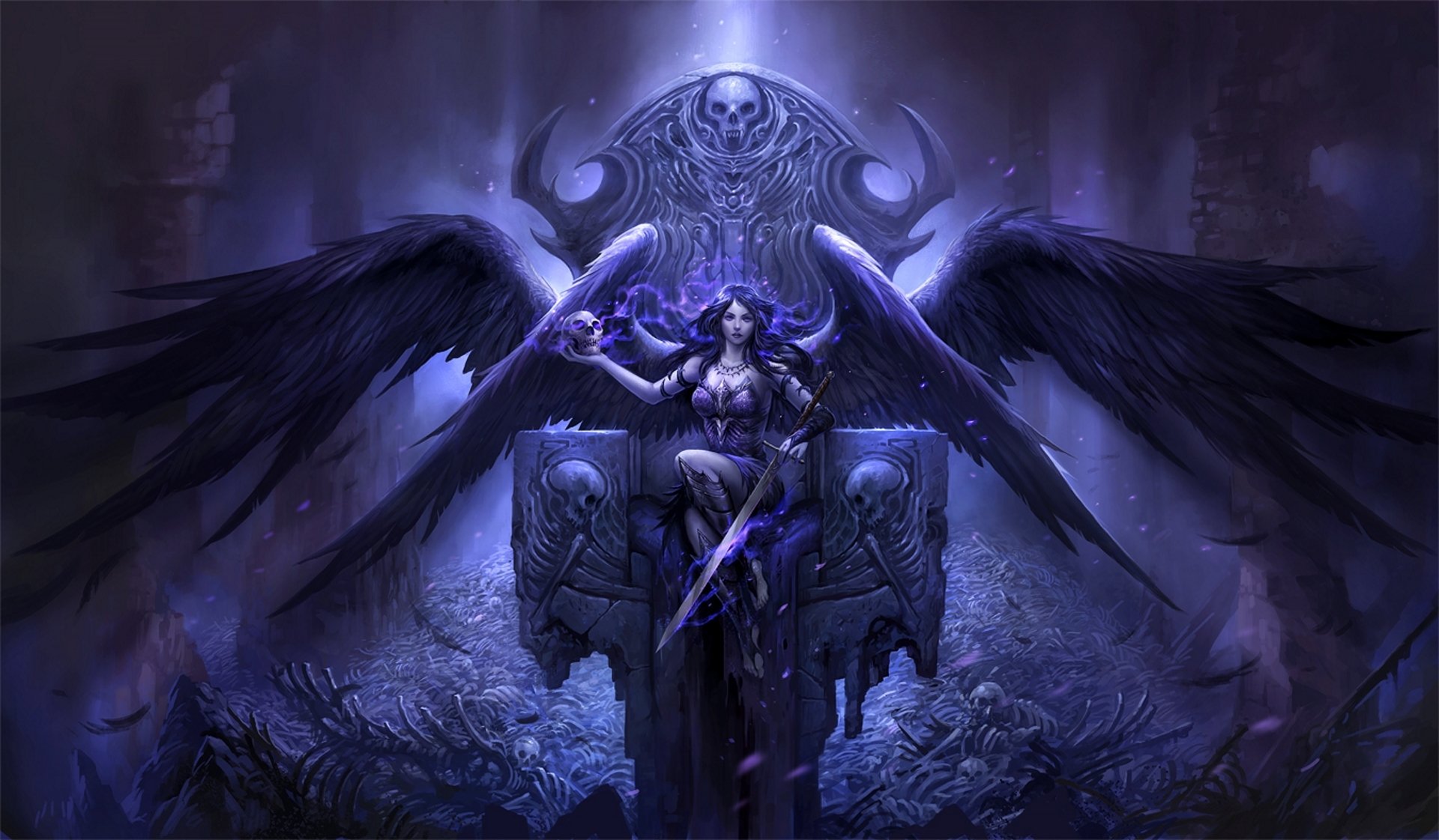 Image tags:angel, girl, wings, feathers, throne, the throne, skeleton, bones, bone, skull, death, sword, bas-relief, relief, ruins, shine, lights, by sandara