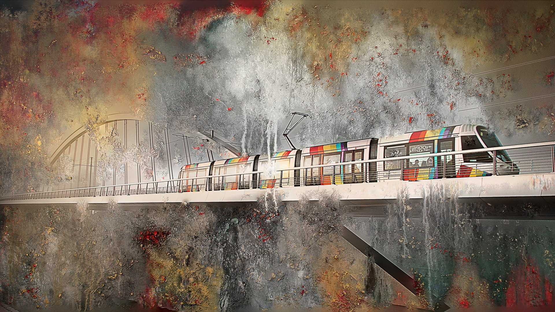 Abstract background of the apocalypse on the bridge with a rainbow train