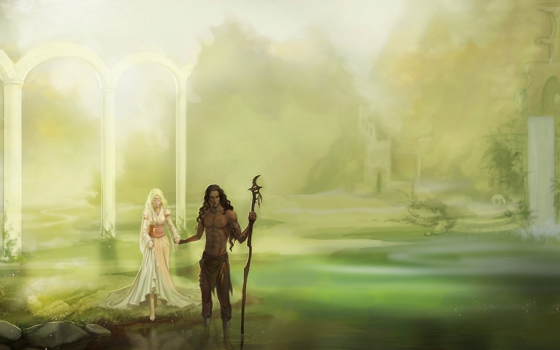 Image tags:art, anndr, guy, girl, water, stones, staff, grass