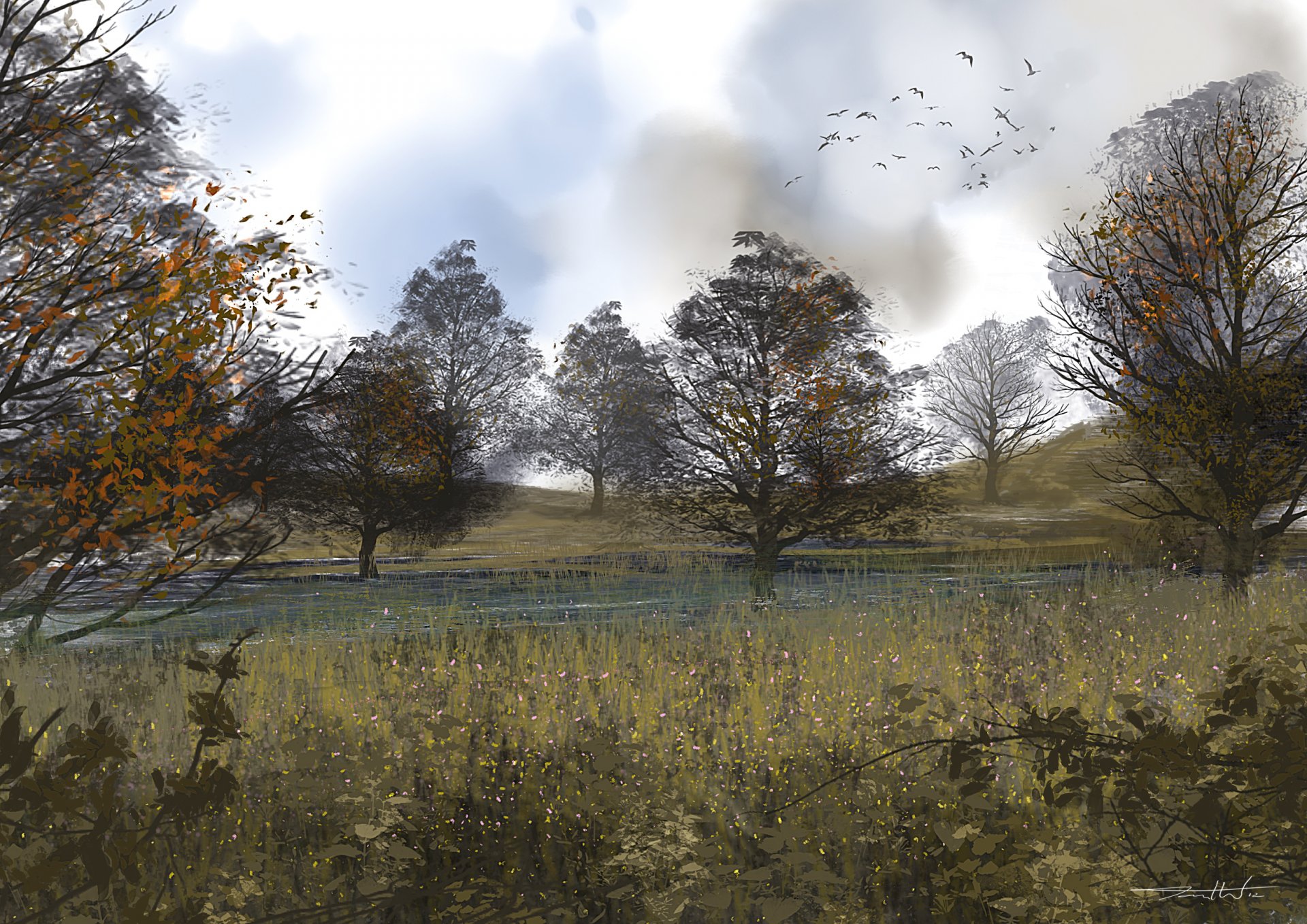 Autumn landscape. Birds in the autumn sky