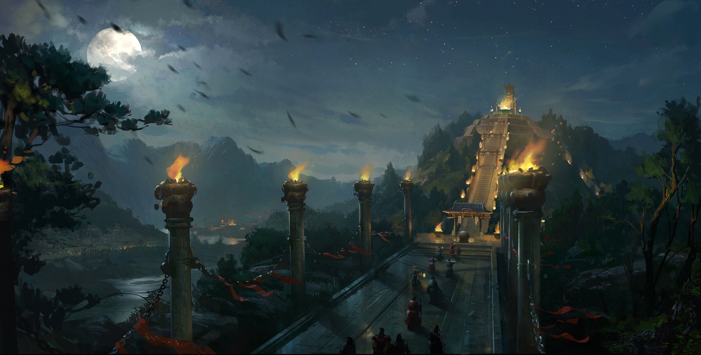 A long staircase lit by torches