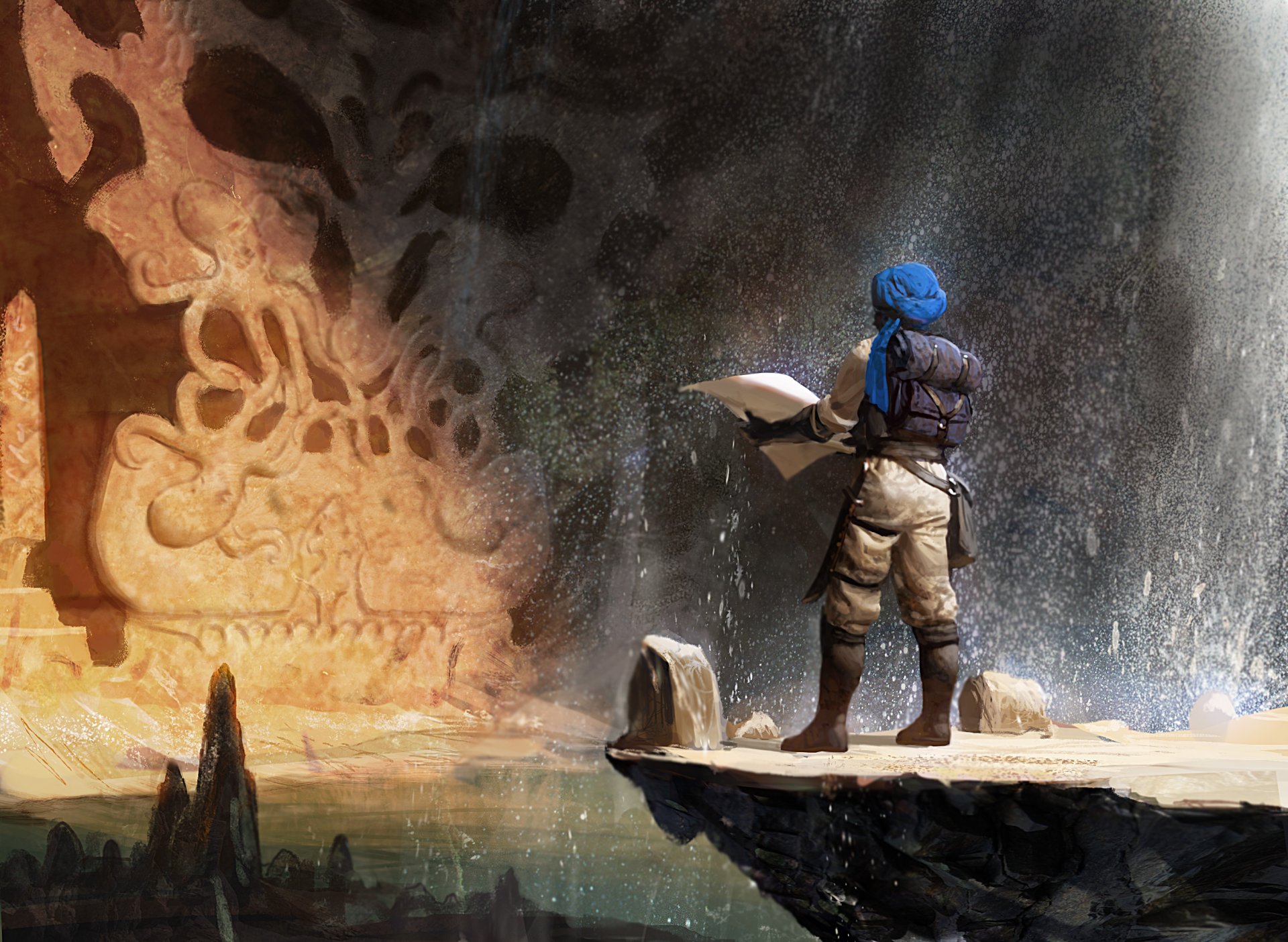 The cave and the traveler he has a map and a scroll