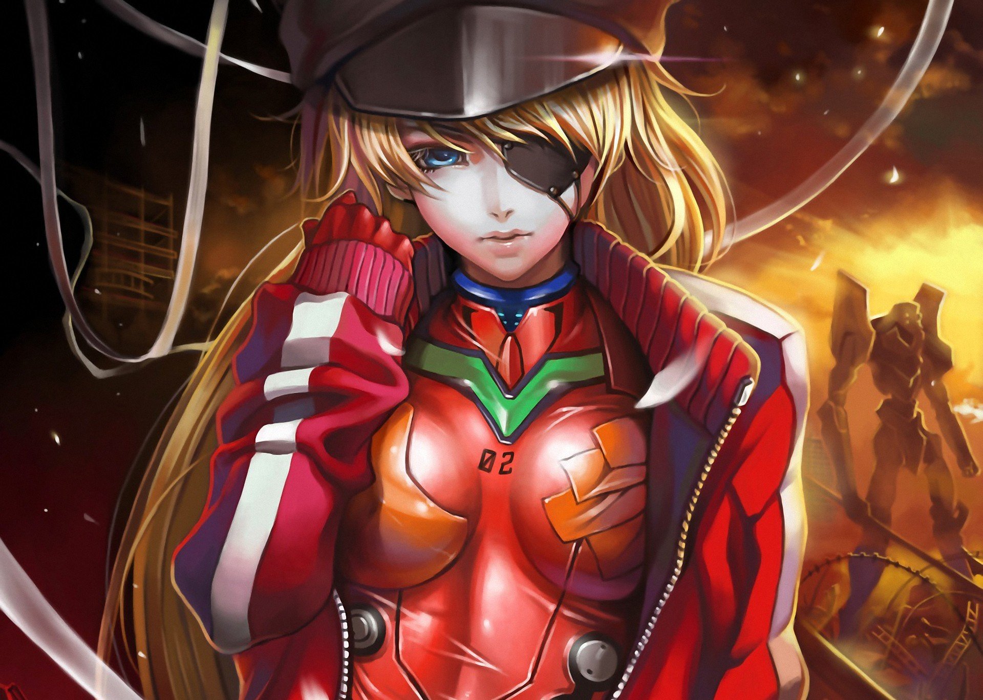 Image tags:art, dantewontdie, neon genesis evangelion, soryu asuka langley, girl, cap, bandage, robots, fur