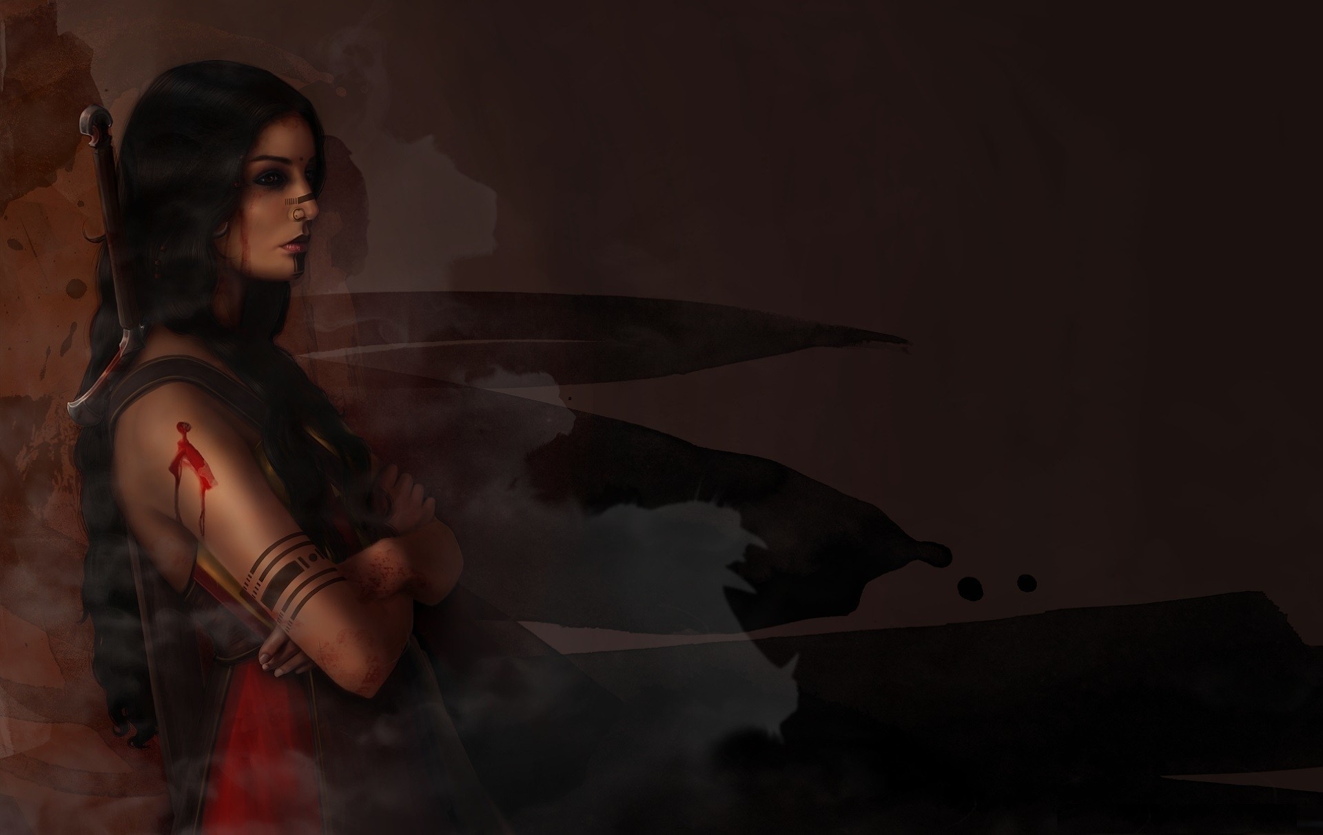 Image tags:art, face, girl, barbarian, hand, wounded, sword, weapon, section, piercing, blood