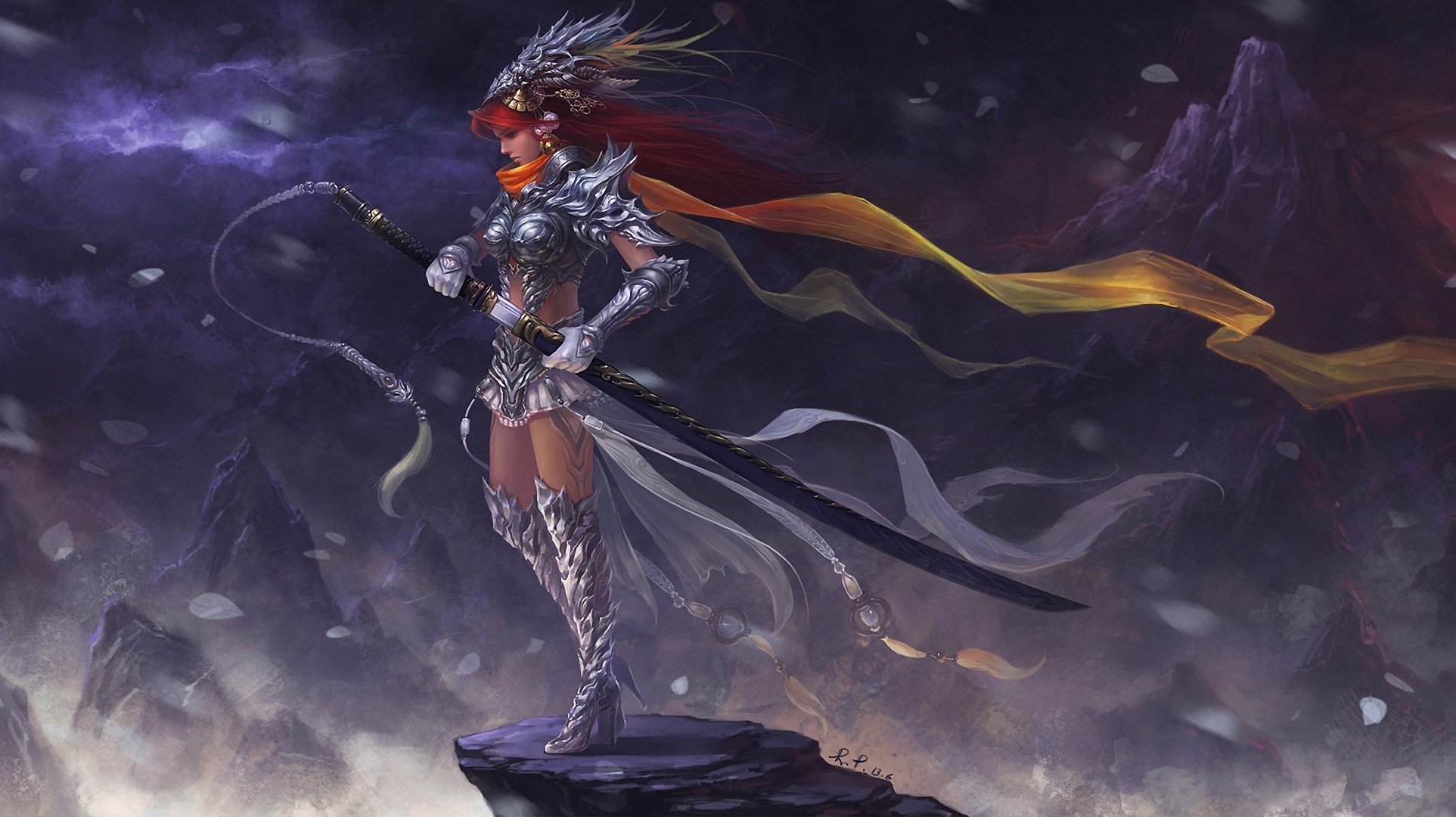 Image tags:art, fantasy, girl, sword, mountain, rock