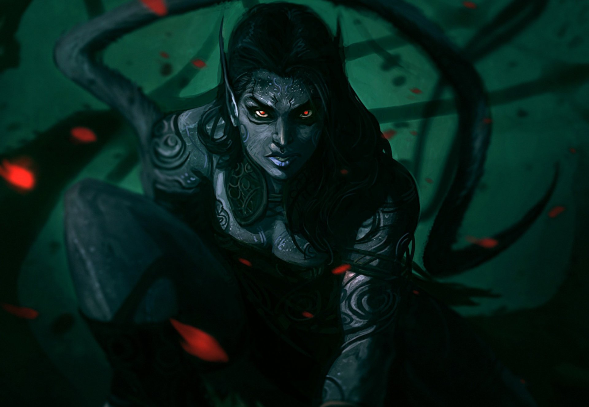 Fantasy art girl with tattoos, pointed ears and red eyes