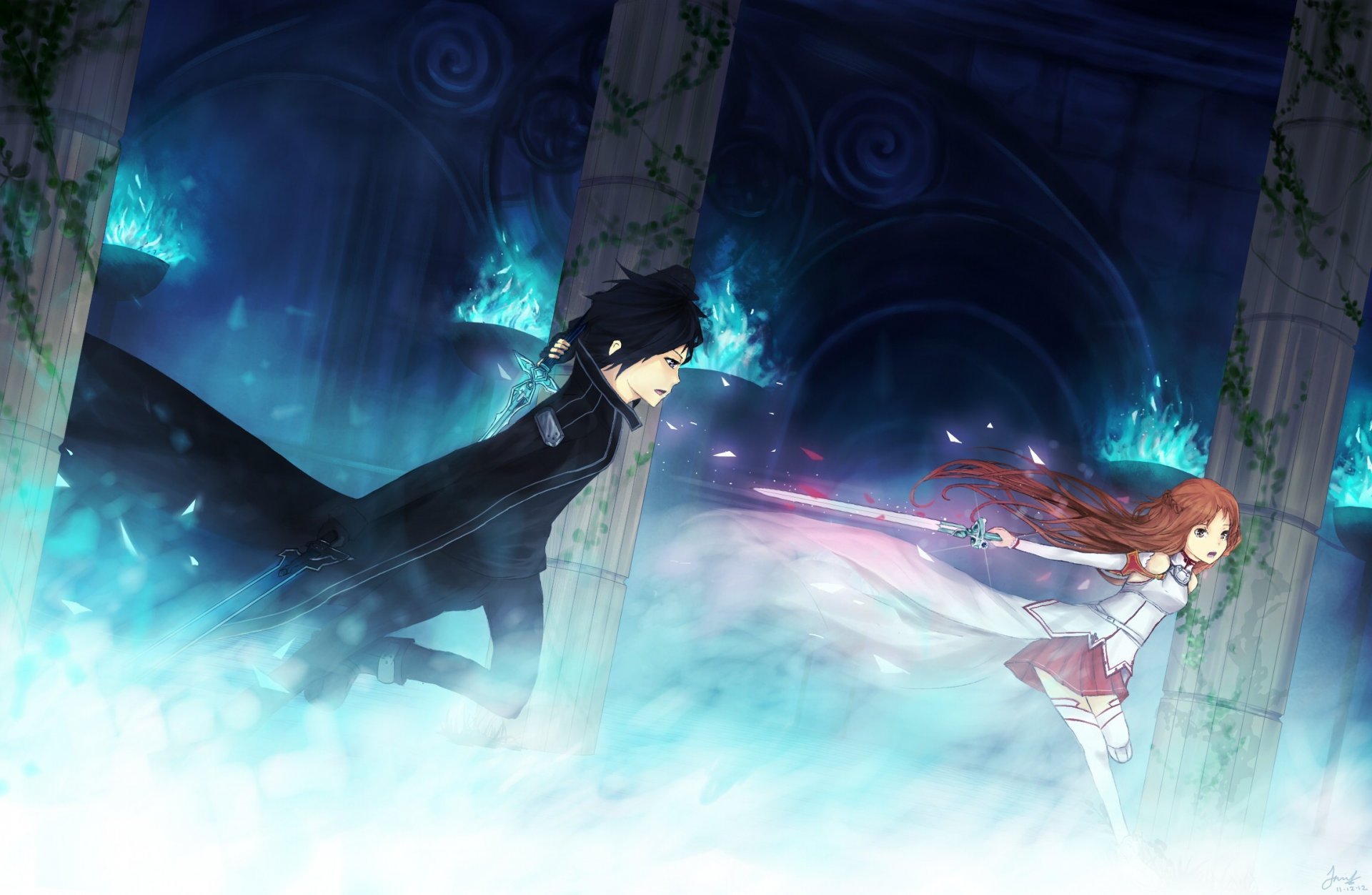 Image tags:art, girl, yuuki asuna, guy, kirito, weapon, sword, battle, column, magic, fire, sword art online, sword master online
