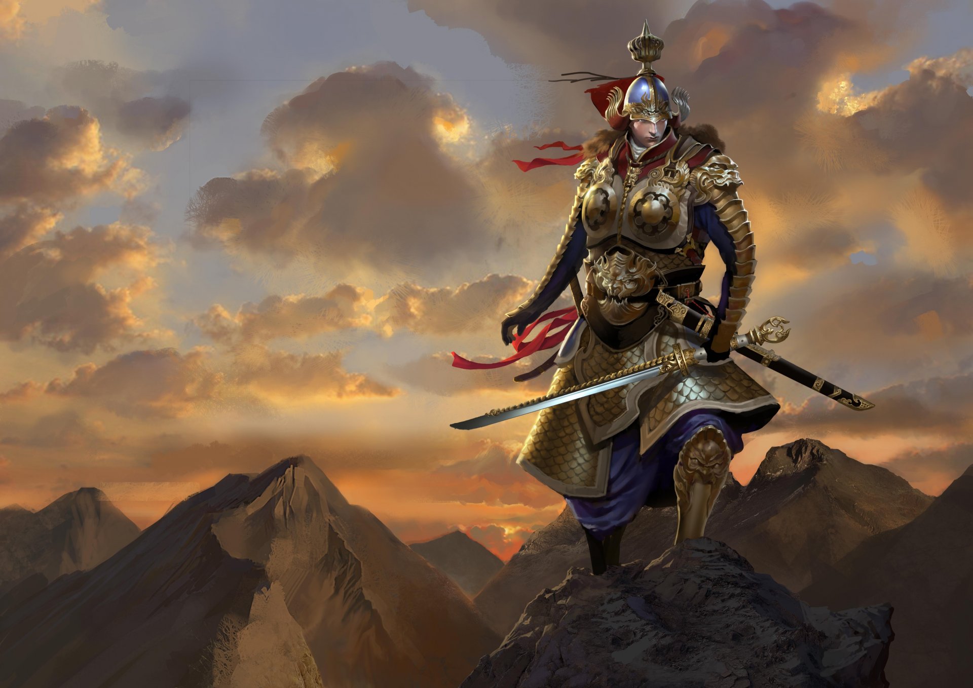 Image tags:art, jiang you, plays, rock, men, warrior, sword, armour, summit