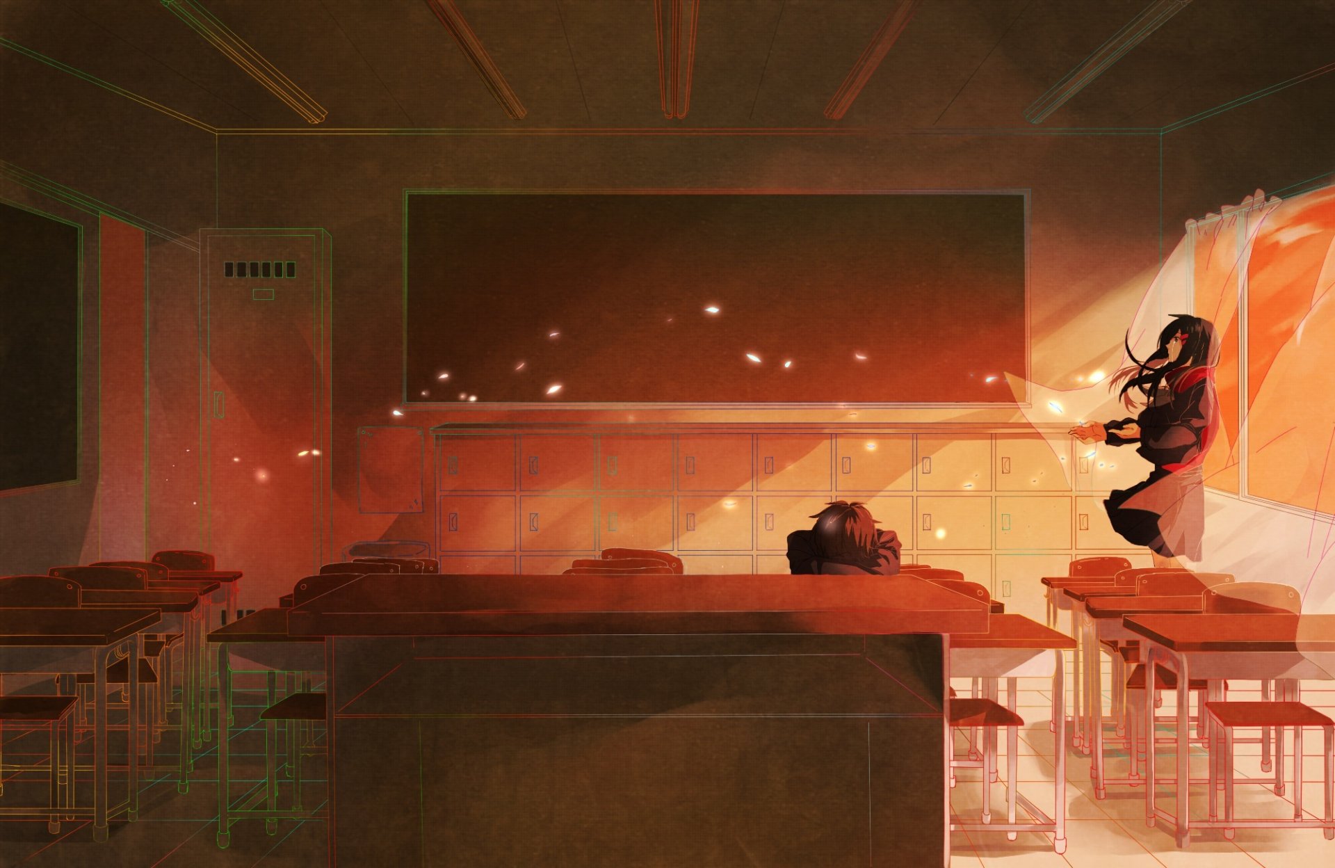Image tags:art, keshitsubu, kagerou project, kisaragi shintaro, tateyama ayano, girl, guy, class, cabinet, board, wind, anime