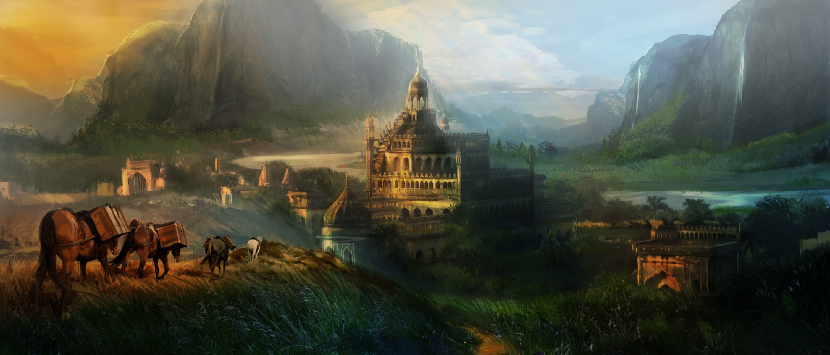 A caravan of horses on the background of mountains and waterfalls
