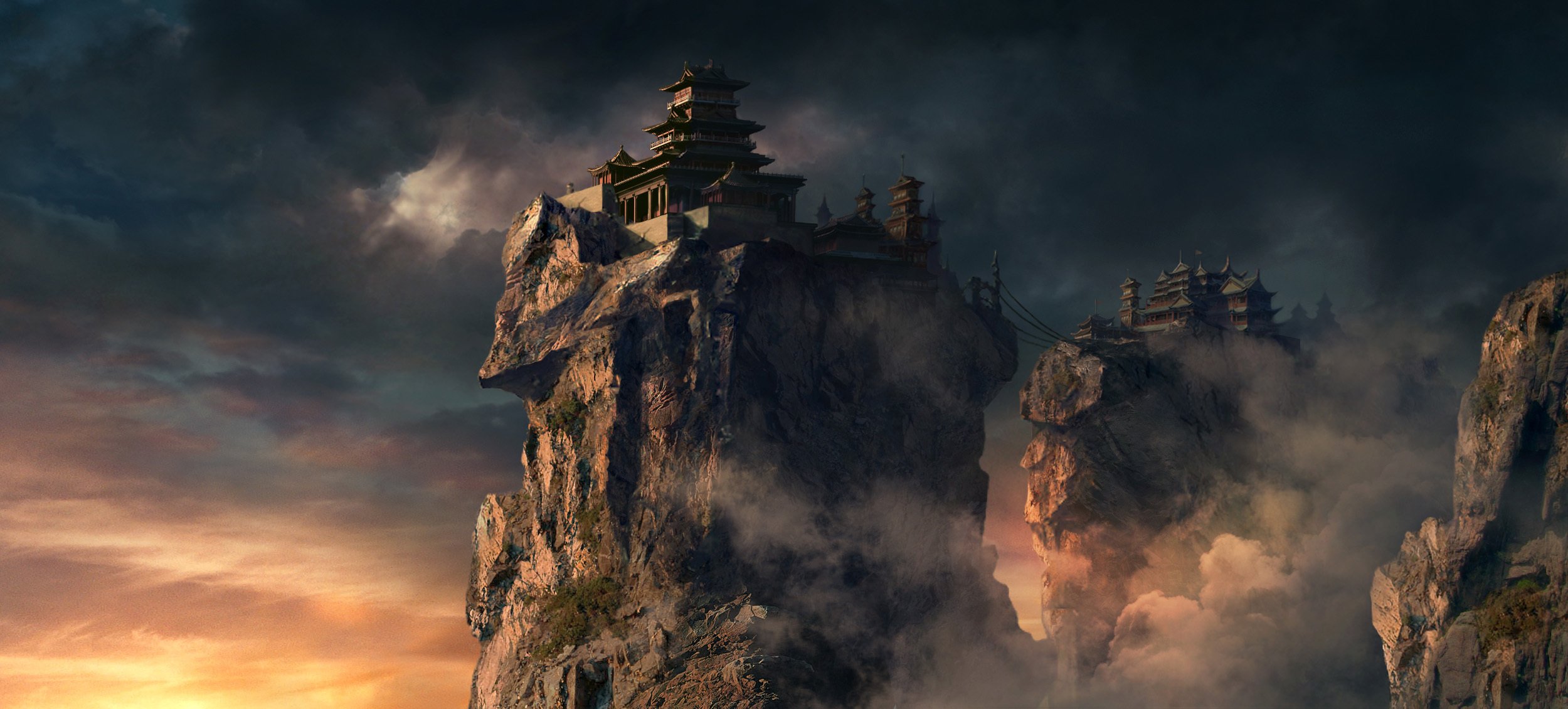 Art, feng liu , temples on rocks and rope bridge