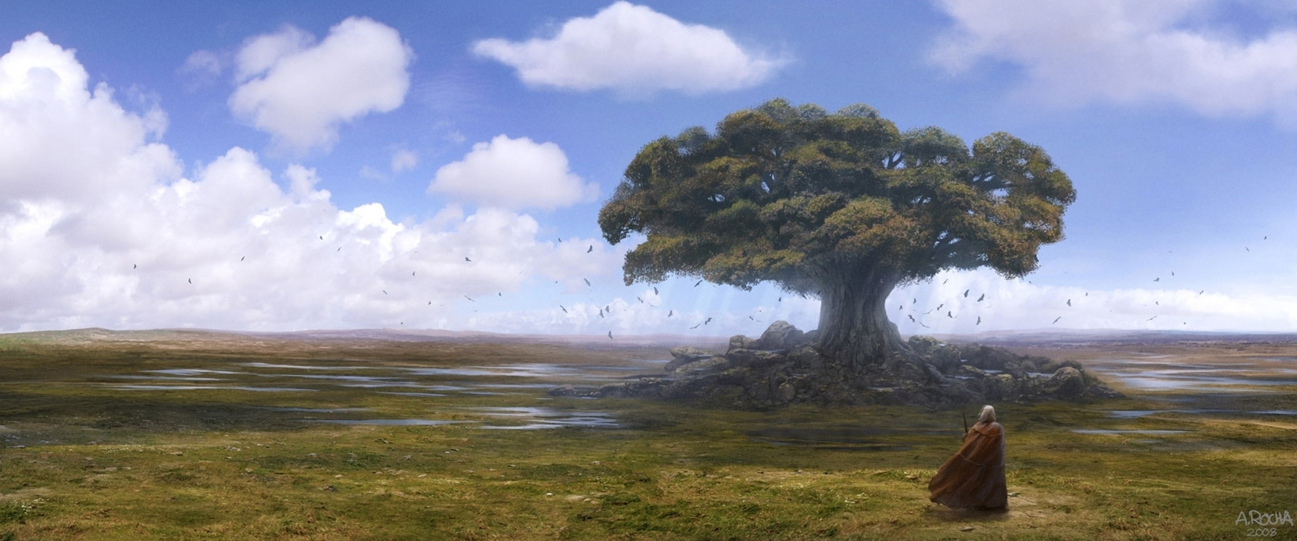 Image tags:art, tree, grass, horizon, water, clouds, the field, raven, traveler