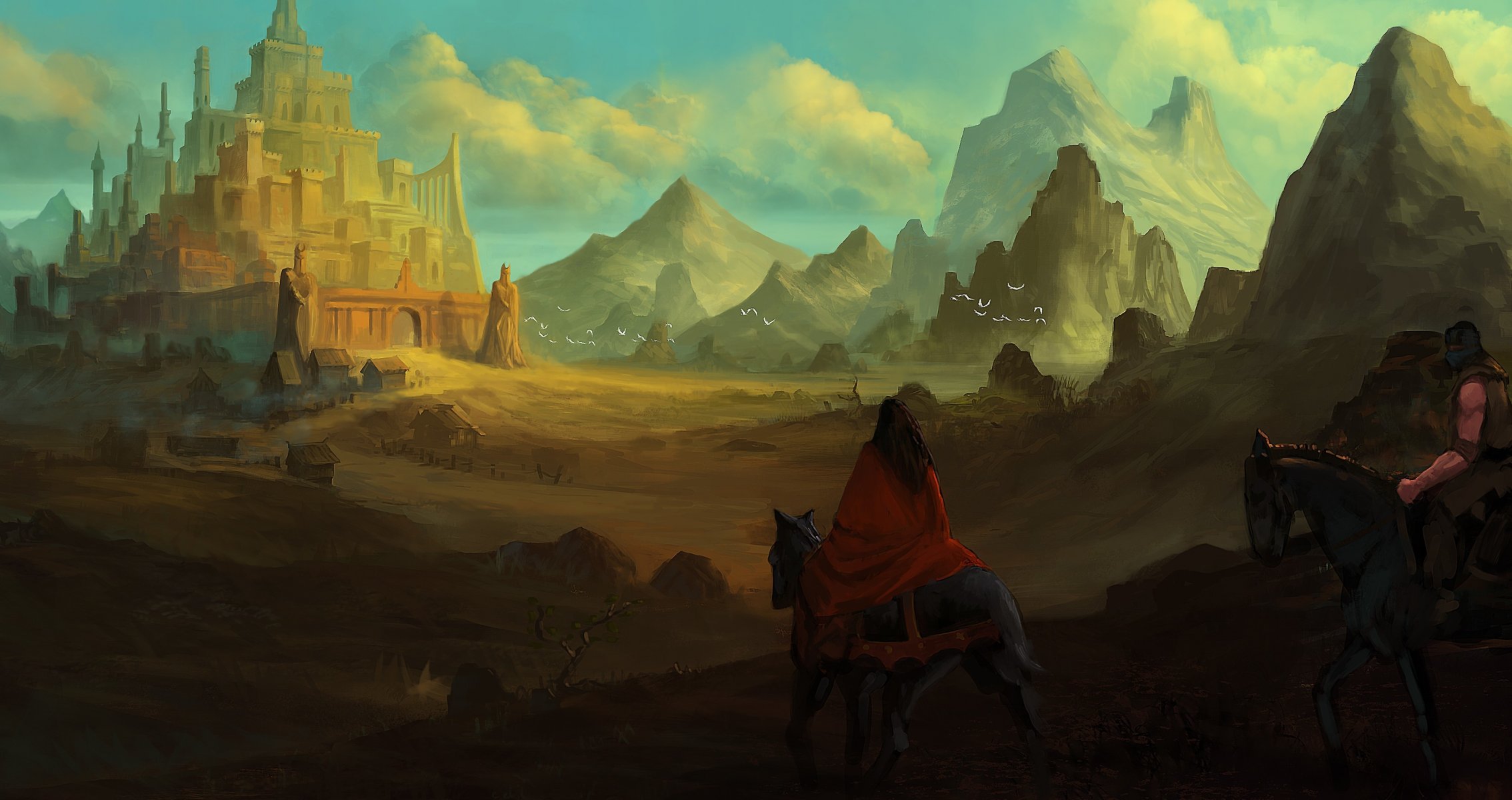 Colorful illustration of a traveler on a horse